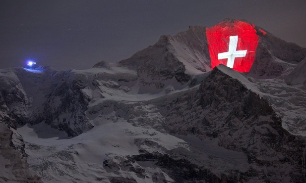Artysta Gerry Hofstetter wyświetlił ogromną flagę Szwajcarii na północnym zboczu góry Jungfrau. Ta wiekowa linia kolejowa jest najwyższą w Europie i korzysta z niej dziennie ok. 5 tyś pasażerów.