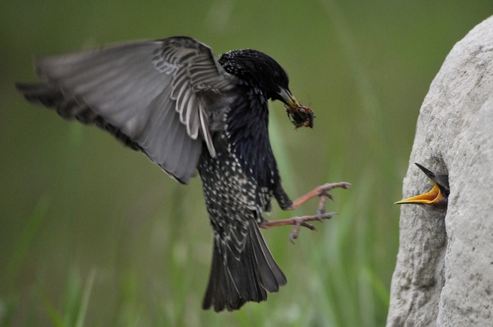 To pisklę to mały szpak. A nadlatujący ptak to duży szpak. Szkoda, że nie możemy posłuchać, jak śpiewają. Szpaki potrafią naśladować odgłosy innych ptaków, a nawet ludzki głos.