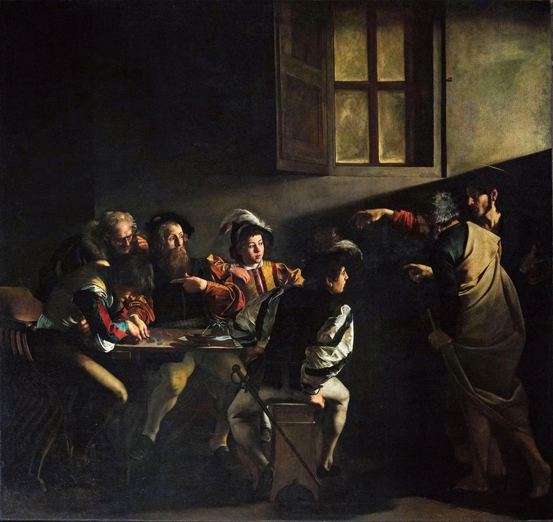 To o tyle ciekawe, że niektórzy na tym obrazie wcale nie są zainteresowani pojawieniem się Jezusa. Widać to wyraźnie. Jeden ma ważniejsze sprawy na głowie – musi policzyć pieniądze. Drugi sprawdza, czy tamten dobrze liczy. Pozostali zauważyli, że ktoś wszedł, trochę się zdziwili, spojrzeli zaciekawieni. Ewangelia mówi, że Jezus wskazał na Mateusza. Ale który to spośród nich? Jedni twierdzą, że to ten, który wskazuje palcem, jakby pytał Jezusa: „Czy mnie wybierasz?”. Inni mówią, że Mateusz to ten, który liczy pieniądze i jest tak zajęty, że nawet nie zauważył, kiedy Bóg wszedł. Jedno jest pewne: Jezus woła. W tej grupie zawołał Mateusza. Tego się nikt nie spodziewał, a już na pewno nie sam Mateusz. Do głowy mu nie przyszło, że już za chwilę jego życie zmieni całkowicie, że już nie będzie takie samo.